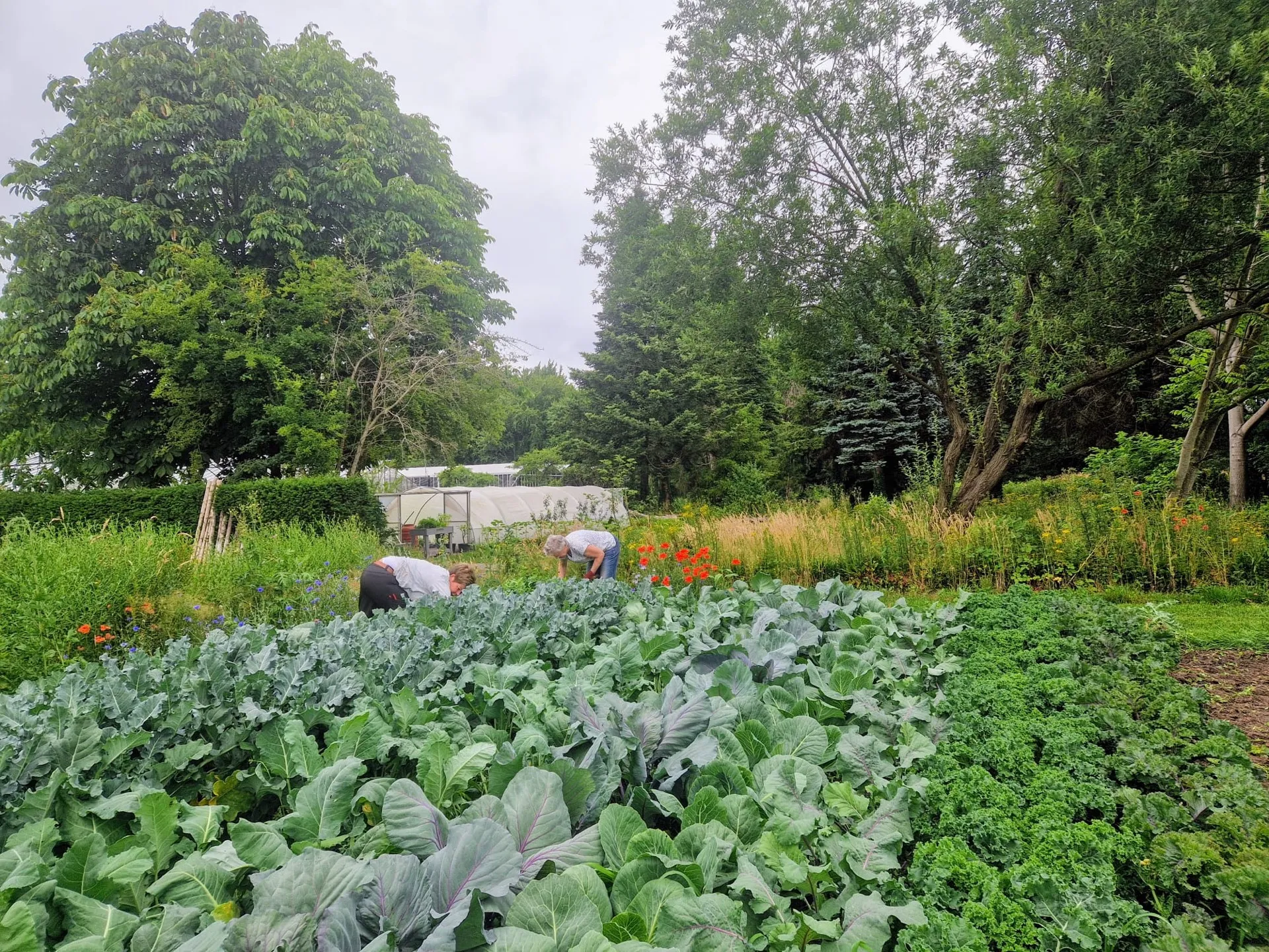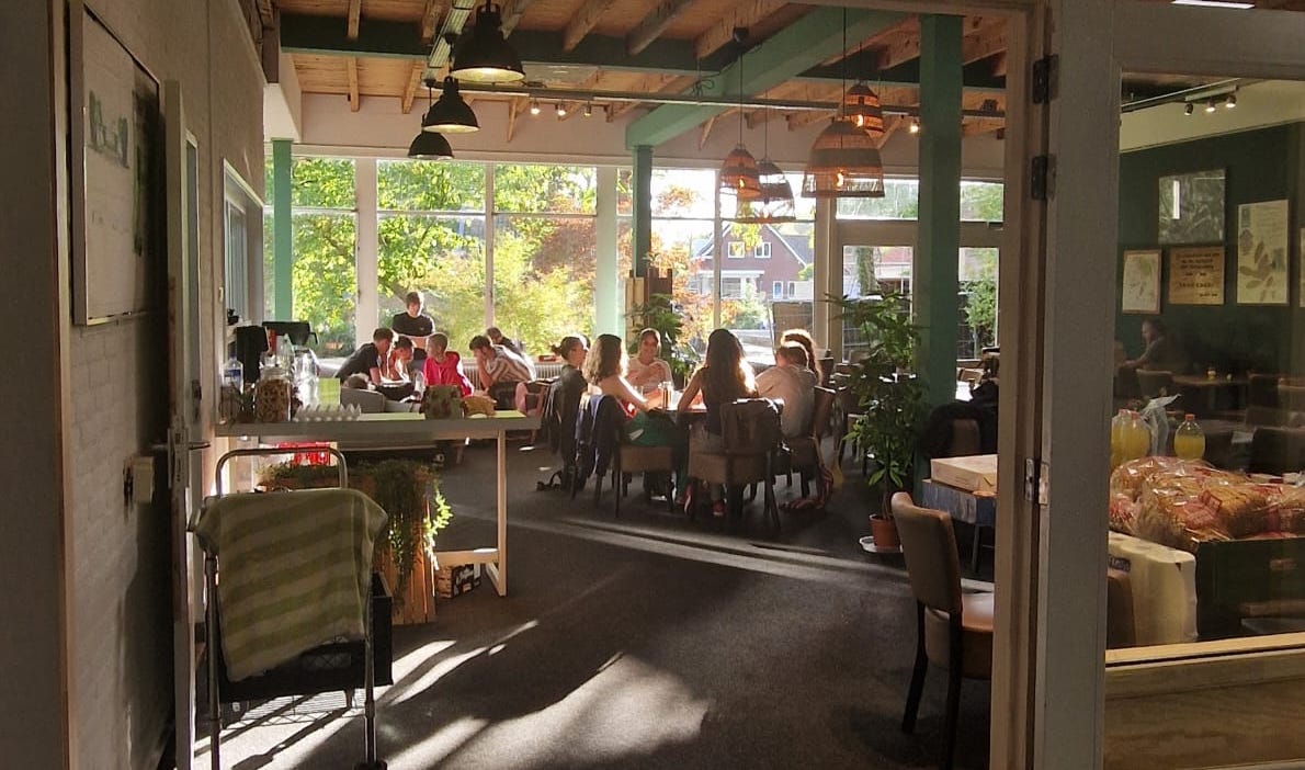 Een flink deel van wat op je bord komt groeide in de tuinen van de campus. Van kruiden tot pompoen tot spinazie — het seizoen bepaalt de kaart.